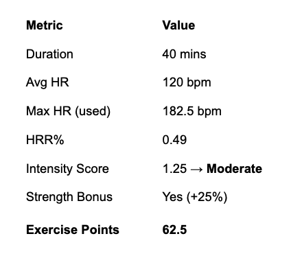 Exercise Points = Duration × Intensity + 25% bonus (for strength training)