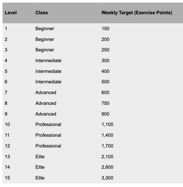 Each Level has a weekly Exercise Points target.